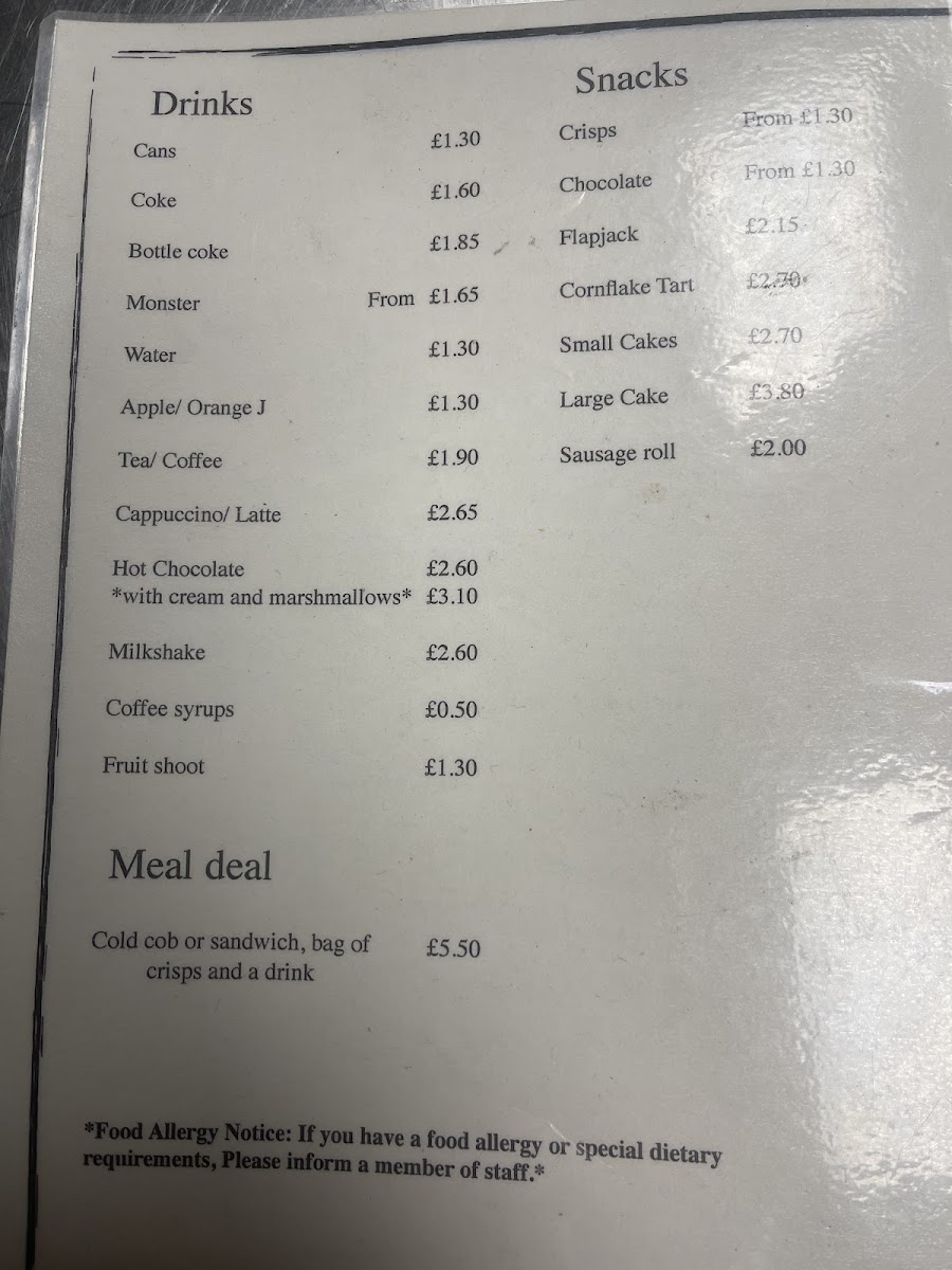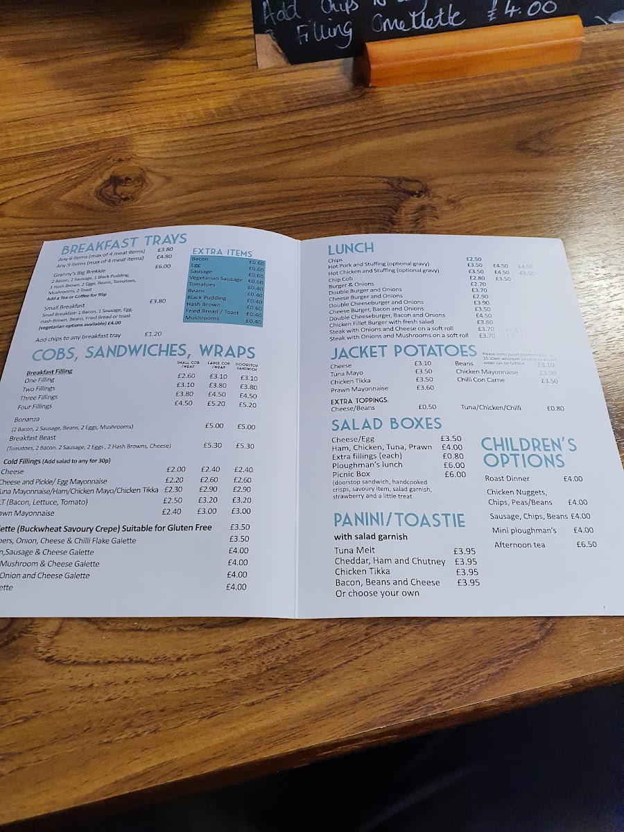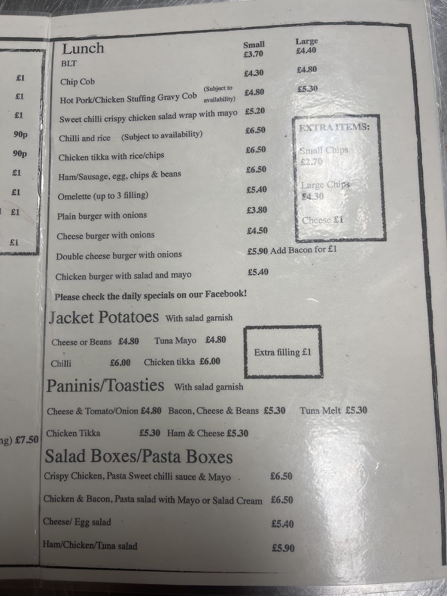 Panini and Toasties present a range of toasted options including Tuna Melt, Cheddar, Ham and Chutney, Chicken Tikka, and Bacon, Beans and Cheese, offering a mix of traditional and spiced fillings.