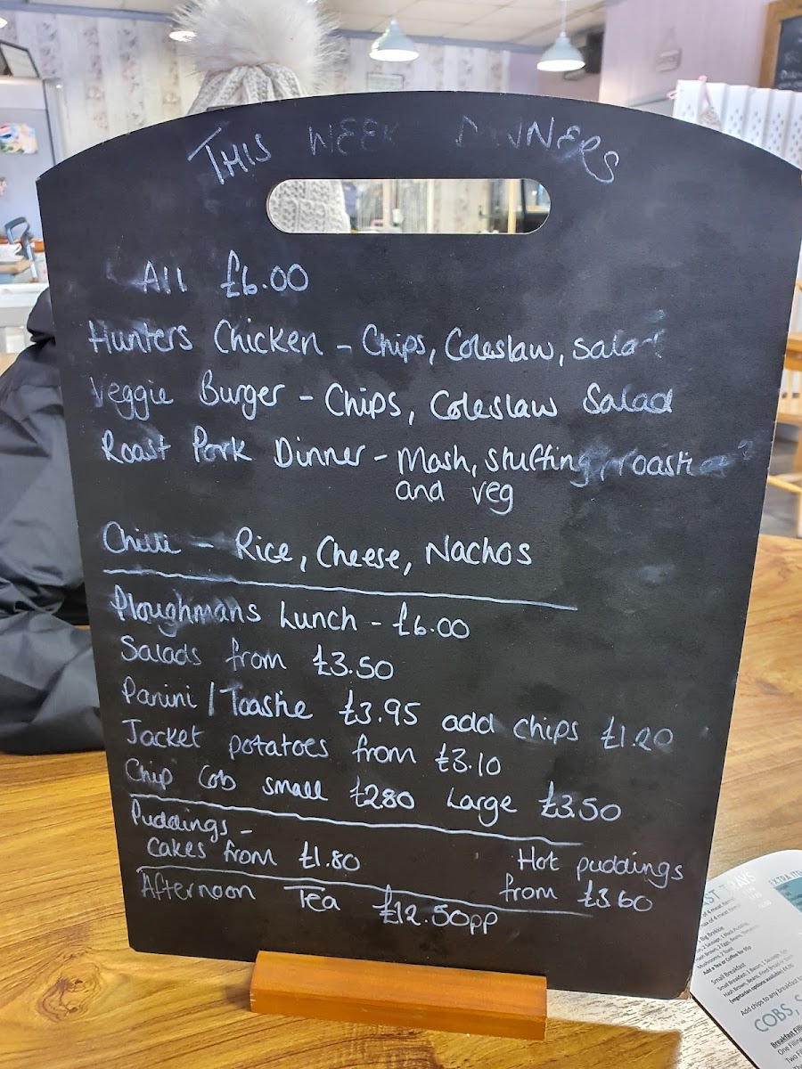 Main and Other Dishes feature options like Hot Puddings, Hunters Chicken, a Veggie Burger, and Roast Pork Dinner, allowing for varied meal preferences including vegetarian choices.